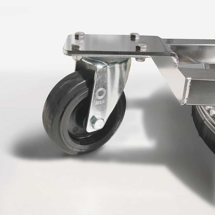 Fahrbarer Bodenreiniger mit Lanzenköcher für die Hochdrucklanze zur Extra-Reinigung in Ecken oder an Wänden. Robustes Edelstahldesign mit Verstärkungen für härteste Einsatzbedingungen in der Landwirtschaft. Vorn montierte Lenkrolle in 30 mm Breite, eignet sich optimal zum Fahren auf Spaltenböden und ermöglicht einfaches und flexibles Lenken. Anschluss zum Dreharm erfolgt über ein großes Drehgelenk für einen Wasserdurchfluss von bis zu 1.800 l/h. Die nach hinten versetzte Anordnung des stabilen Führungsholms ermöglicht einfaches Unterfahren von Hindernissen wie Tischen oder Abzäunungen. 2 sehr große, mit Schaumstoff ausgeschäumte Hinterreifen ermöglichen problemlos, den Reiniger rückwärts Treppen hochzuziehen.